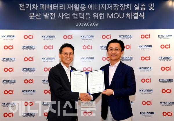 ㅇ 현대차그룹과 OCI는 ‘전기차 폐배터리 재활용 에너지저장장치(ESS) 실증 및 분산발전 사업 협력 양해각서(MOU)’를 체결함 - 이번 사업을 위한 파트너사인 OCI는 2012년 한국기업 최초로 미국에서 대규모 태양광발전소 프로젝트를 수주한 에너지솔루션기업임 |